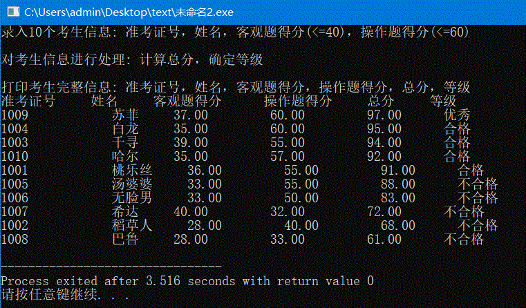 } // 对考生信息进行处理:计算总分,排序,确定等级 void process(STU s[], int n) { // 补足代码 // ××× int i,j; STU temp; for(i=0;i<n;i++) { s[i].sum=s[i].objective+s[i].subjective; } for(i=0;i<n-1;i++) for(j=0;j<n-i-1;j++) if(s[j].sum<s[j+1].sum) { temp=s[j]; s[j]=s[j+1]; s[j+1]=temp; } int k,n1=N*0.1,n2=N*0.4; for(k=0;k<n;k++){ if((k+1)<=n1) strcpy(s[k].level,"优秀"); else if((k+1)>n1&&k<=n2) strcpy(s[k].level,"合格"); else strcpy(s[k].level,"不合格"); } }