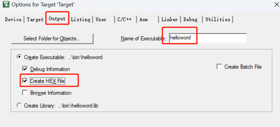 1、设置keil输出HEX文件以及文件名如图:
