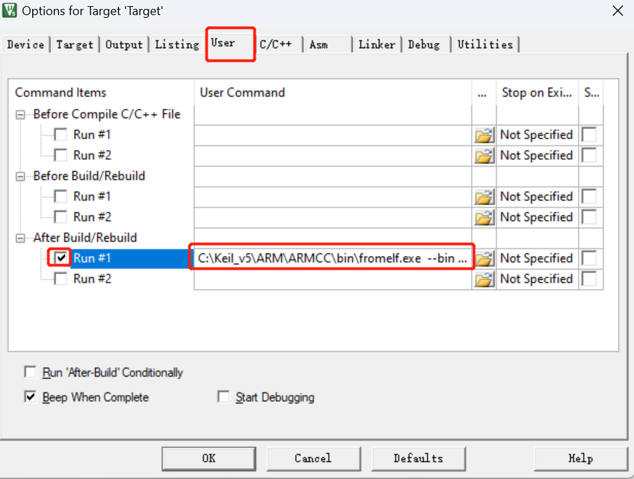 2、输出bin需要使用keil自带的工具,文件路径需要提前找到,如:C:\Keil_v5\ARM\ARMCC\bin