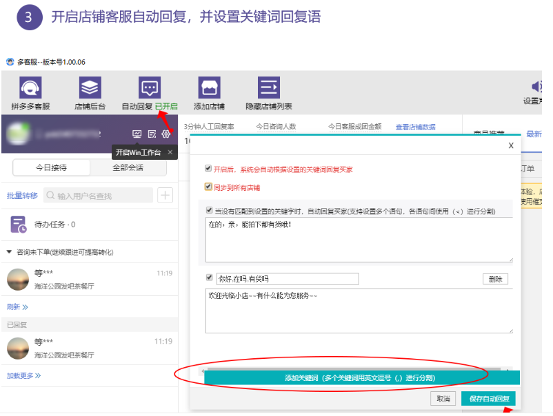 开启店铺客服自动回复,并设置关键词回复语。