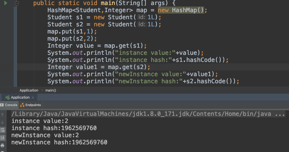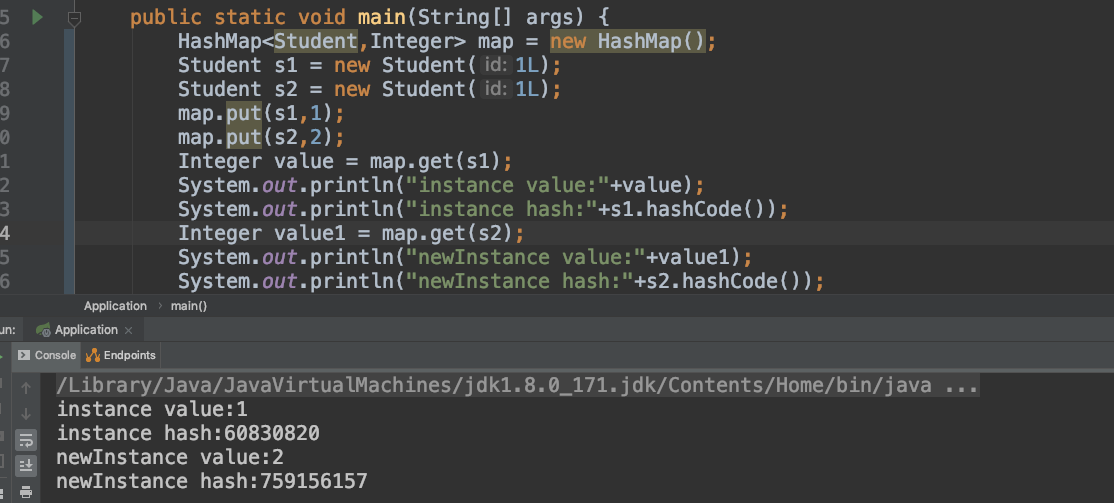 发现,同样的一个对象,为什么在map中存了2份,map的key值不是不能重复的么?没错,它就是存的2份,只不过在它看来,这2个的key是不一样的,因为他们的哈希码就是不一样的,可以自己测试下,上面打印的hash码确实不一样。加上重写hashCode()方法后,运行结果如下: