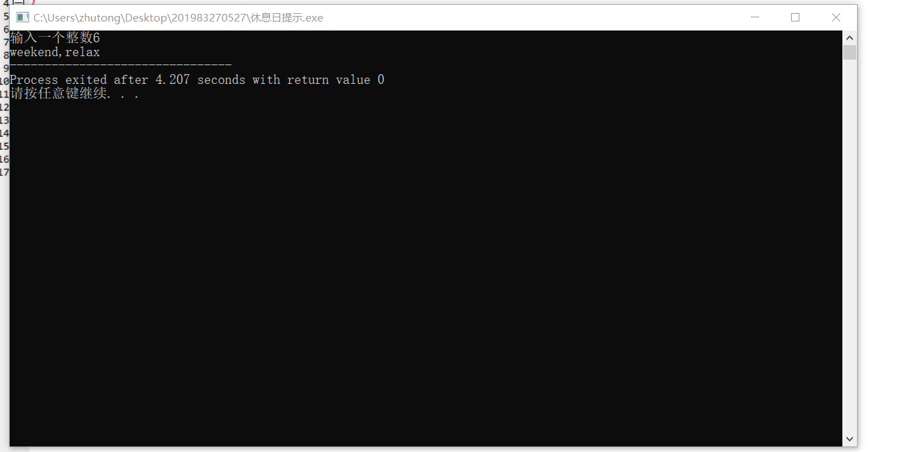 /*判断奇偶数*/ #include<stdio.h> int main() { int x; printf("输入一个整数"); scanf("%d",&x); if(x%2!=0) printf("是奇数"); else printf("是偶数"); return 0; } /*提示休息日*/ #include<stdio.h> int main() { int days; printf("输入一个整数"); scanf("%d",&days); if (days>=1&&days<=5) printf("working days,fighting"); else if(days==6||days==7) printf("weekend,relax"); else printf("ooops,notin1to7"); return 0; } /*转化大写*/ #include<stdio.h> int main() { char ch; printf("输入一个字母"); scanf("%c",&ch); if(ch>='a'&&ch<='z') printf("%c",ch-32); return 0; }