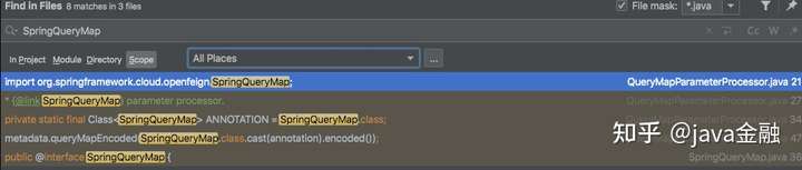 在spring cloud 2.1.x 以上的版本,提供了一个新的注解@SpringQueryMap,为何这个注解可以帮我们实现。源码之下无秘密,我们可以翻翻 feign的源码相对来说应该是比较简单的,我们可以简单的来看下源码。看源码是不是也不知道从哪里看起,从头看到尾肯定也不现实, 不从头开始看,又不知道源码在哪里,有个很简单的方法我们直接拿着这个注解全局搜一下,看看有哪些地方使用到了,在每个地方都打上一个断点试试