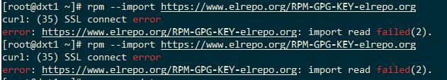 [root@dxt1 ~]# rpm --import https://www.elrepo.org/RPM-GPG-KEY-elrepo.org curl: (35) SSL connect error