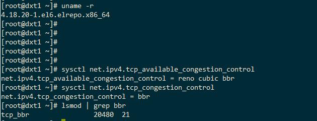[root@dxt1 ~]# sysctl net.ipv4.tcp_available_congestion_control net.ipv4.tcp_available_congestion_control = reno cubic bbr [root@dxt1 ~]# sysctl net.ipv4.tcp_congestion_control net.ipv4.tcp_congestion_control = bbr [root@dxt1 ~]# lsmod | grep bbr tcp_bbr 20480 21