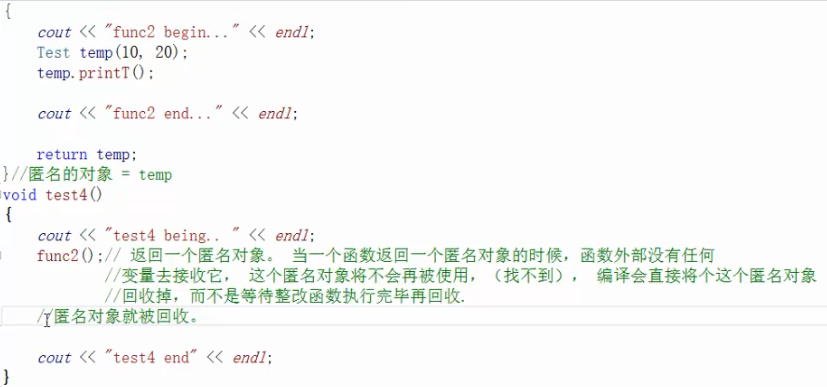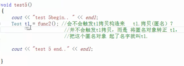 3.1 如果函数返回值是用一个对象接收的,那么会发生一个值拷贝,通过拷贝构造函数创建一个匿名对象。如下有函数Test func2(){ }: