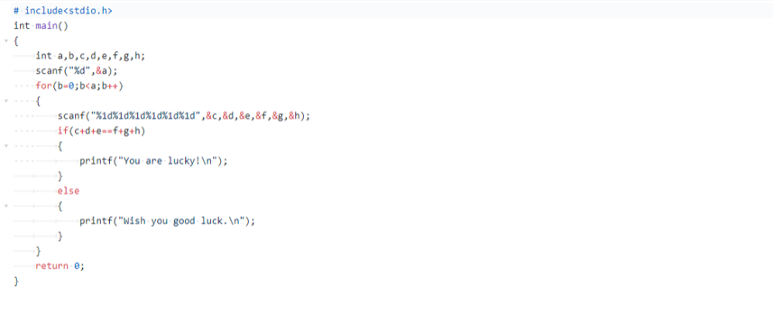 同学2的代码是直接通过输入的每一个数字来直接将其相加,之后再进行输出,最后判断彩票是否是幸运的。