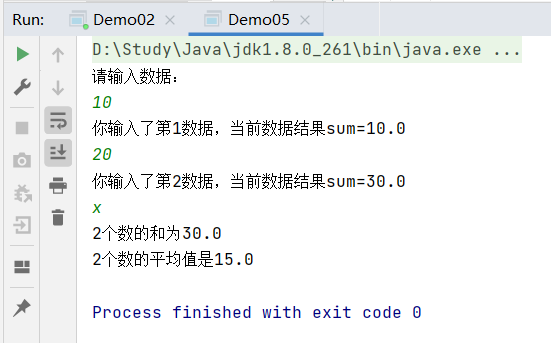 //我们可以输入多个数字,并且求其总和与平均数,没输入一个数字用回车确认,通过输入非法数字来结束并输出执行结果