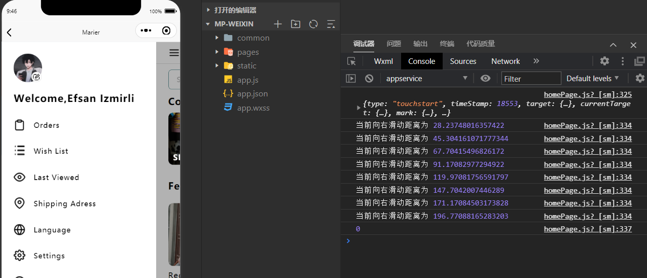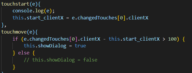 外层绑定触摸事件,获取触摸起始位置坐标(a)和过程的位置坐标(b),if语句判断当 b - a 大于100的话则显示侧滑栏(showDialog=true)