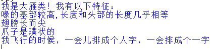 whildGoose.fly("我飞行的时候,一会儿排成个人字,一会排成个一字")