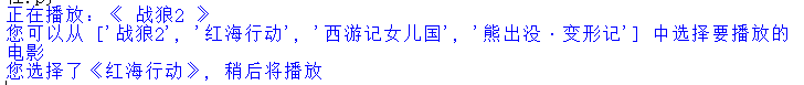 print('\n请选择正在上映的电影:1、《长津湖》 2、《战狼2》3、《红海行动》')