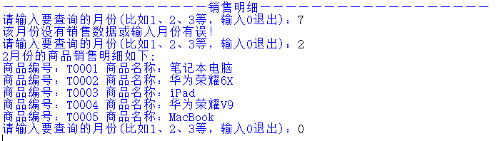 模拟实现输出进销存管理系统中的每月销售明细,运行程序,输入要查询的月份,如果输入的月份存在销售明细,则显示本月商品销售明细;如果输入的月份不存在或不是数字,则提示“该月没有销售数据或者输入的月份有误!”。效果如图7.24所示。