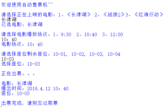 print('\n请选择座位剩余座位:10-01, 10-02, 10-03, 10-04')