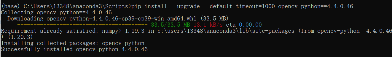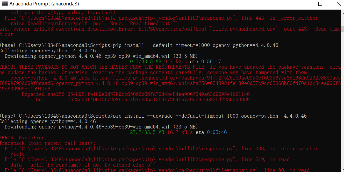 如图,可看到异常,解决办法:需要在pip时,添加"--upgrade"参数即可。通常这时下载还会报错timeout,因此多加一个"--default-timeout=100000" 更为保险(timeout的赋值可以视情况变化)。