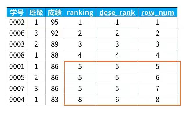 例 :select *,rank() over (order by 成绩 desc)as ranking,