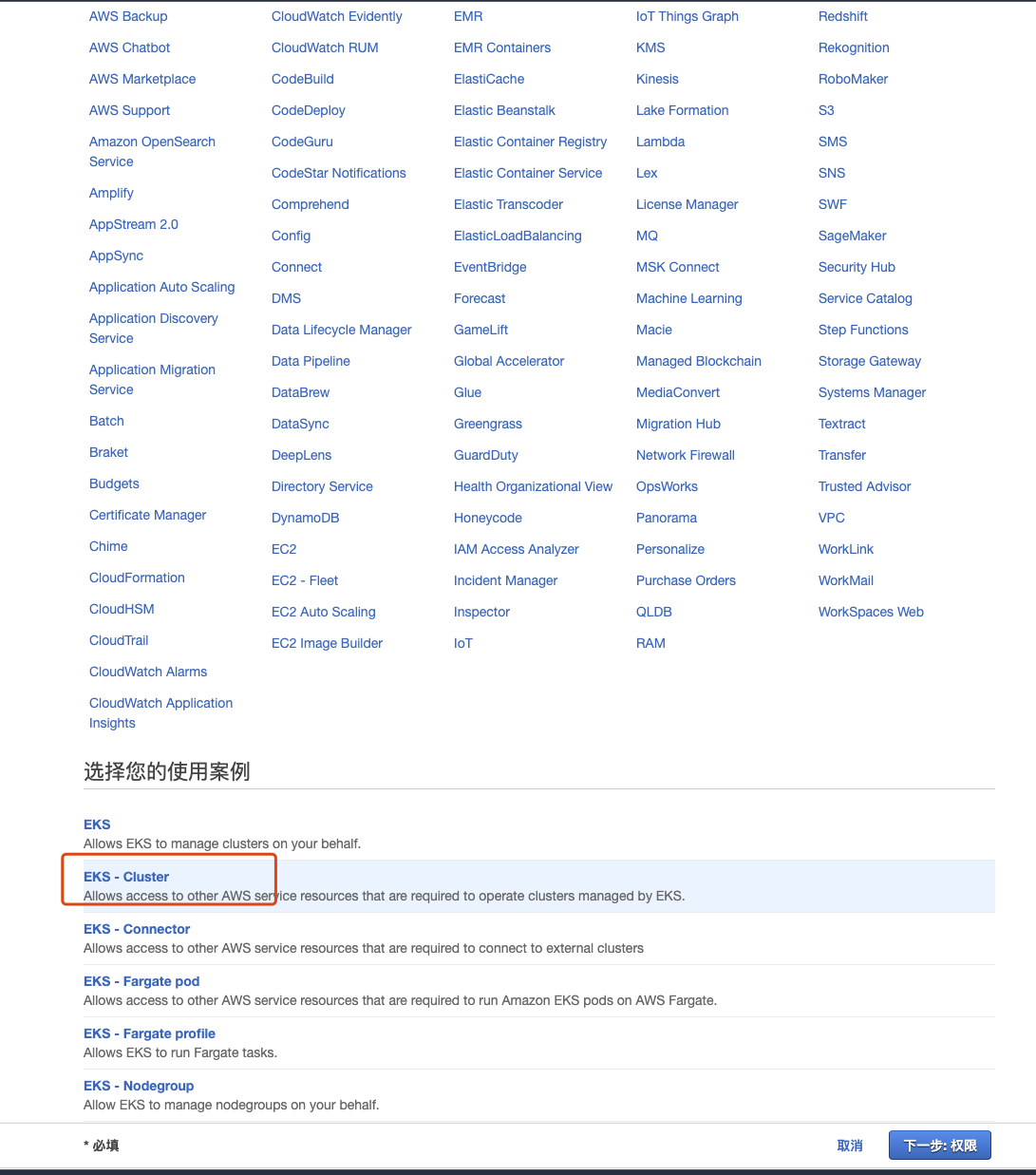 IAM控制台--创建角色--EKS--EKS-Cluster--下一步--下一步--定义名称--完成
