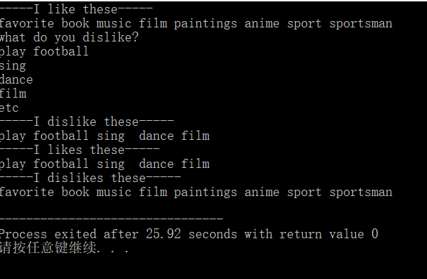 #include <iostream> #include <vector> #include <string> using namespace std; // 函数声明 void output1(vector<string> &); void output2(vector<string> &); int main() { vector<string>like, dislike; // 创建vector<string>对象likes和dislikes like.push_back("favorite book") ; like.push_back("music"); like.push_back("film"); // 为vector<string>数组对象likes添加元素值 ( favorite book, music, film, paintings,anime,sport,sportsman,etc) like.push_back("paintings");// 补足代码 like.push_back("anime"); like.push_back("sport"); // 。。。 like.push_back("sportsman"); cout << "-----I like these-----" << endl; output1(like);// 调用子函数输出vector<string>数组对象likes的元素值 cout<<"what do you dislike?"<<endl;// 为vector<string>数组对象dislikes添加元素值 string s1;// 补足代码 while(true) { getline(cin,s1); if(s1!="etc") dislike.push_back(s1); else break; } cout << "-----I dislike these-----" << endl; output2(dislike);// 调用子函数输出vector<string>数组对象dislikes的元素值 like.swap(dislike);// 交换vector<string>对象likes和dislikes的元素值 cout << "-----I likes these-----" << endl; output1(like);// 调用子函数输出vector<string>数组对象likes的元素值 cout << "-----I dislikes these-----" << endl; output2(dislike);// 调用子函数输出vector<string>数组对象dislikes的元素值 return 0; } // 函数实现 // 以下标方式输出vector<string>数组对象v的元素值 void output1(vector<string> &v) { for(int i=0;i<v.size();i++) cout<<v[i]<<" "; cout<<endl; } // 函数实现 // 以迭代器方式输出vector<string>数组对象v的元素值 void output2(vector<string> &v) { vector<string> ::iterator it; for(it=v.begin();it!=v.end();it++) cout<<*it<<" "; cout<<endl; }
