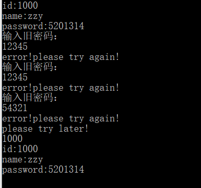 #include<iostream> #include"user.h" #include<string> using namespace std; user::user(string namex, string passwordx):name(namex),password(passwordx){ id=++CurrentID; } void user::changenumber() { int i=0; string m,n; while(true) { cout<<"输入旧密码:"<<endl; cin>>m; if(m==password) { cin>>n; password=n; cout<<"new password:"<<password<<endl; break; } else { cout<<"error!please try again!"<<endl; i++; if(i<3) continue; else { cout<<"please try later!"<<endl; break; } } } } void user::print() { cout<<"id:"<<id<<endl; cout<<"name:"<<name<<endl; cout<<"password:"<<password<<endl; } void user::showcurrentID() { cout<<CurrentID <<endl; cout<<"id:"<<id<<endl; cout<<"name:"<<name<<endl; cout<<"password:"<<password<<endl; } int user::CurrentID=999;