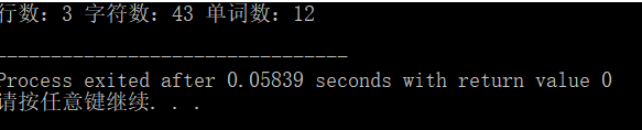 #include<iostream> #include<fstream> #include<string> using namespace std; int main() { ifstream infile("golden god.txt"); int line = 0; int num1 = 0; int word = 0; string s1; int m; while (getline(infile, s1)) { m = s1.size(); line++; num1 += m; for (int i = 0;i < m; i++) { if (s1[i] >= 'A'&&s1[i] <= 'Z' || s1[i] >= 'a'&&s1[i] <= 'z') { if (s1[i + 1] >= '!'&&s1[i + 1] <= '/'||s1[i+1]==' '||s1[i+1]>=':'&&s1[i+1]<='?') { word++; } } } } infile.close(); cout <<"行数:"<< line << " 字符数:" << num1 <<" 单词数:"<<word<< endl; return 0; }