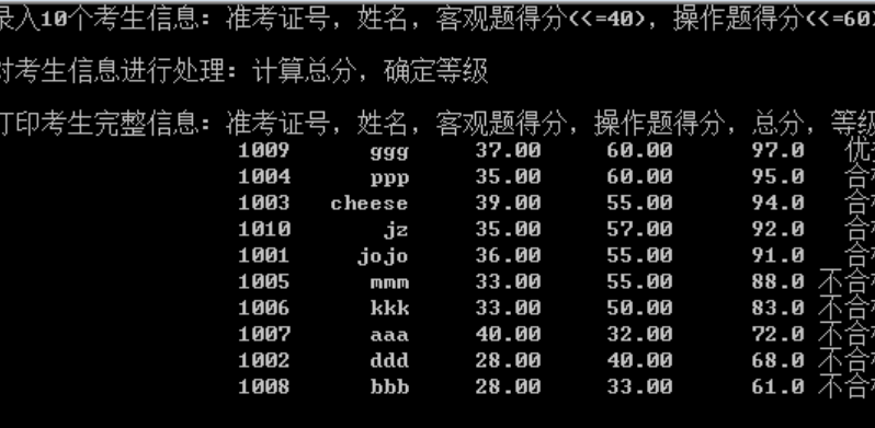 printf("\n打印考生完整信息: 准考证号,姓名,客观题得分,操作题得分,总分,等级\n");