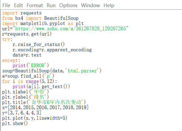 总结一下,从matplotlib库的安装,到爬虫再到折线图的绘制都相对来说比较顺利,当然也跟难度等级较低有一定关系。但是初次尝试python数据分析,真的感受到计算机的强大以及自己的能力十分有限,是一个很神奇的过程,也非常有成就感。在接下来的学习中,要继续努力,不断学习,尝试更多的处理方法。