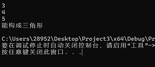#include <stdio.h> int main() { double a, b, c; // 输入三边边长 scanf_s("%lf%lf%lf", &a, &b, &c); // 判断能否构成三角形 // 补足括号里的逻辑表达式 if (a + b > c && a + c > b && b + c > a) { printf("能构成三角形\n"); } else { printf("不能构成三角形\n"); } return 0; }