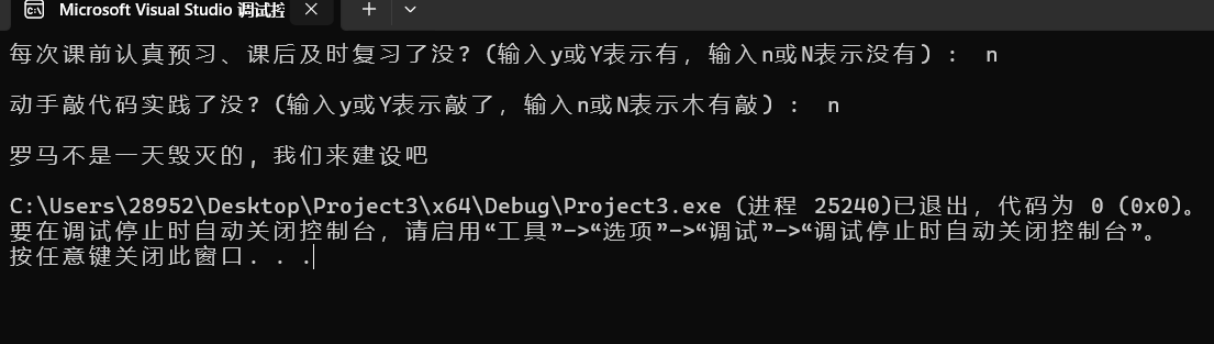 #include <stdio.h> int main() { char ans1, ans2; // 用于保存用户输入的答案 printf("每次课前认真预习、课后及时复习了没? (输入y或Y表示有,输入n或N表示没有) : "); ans1 = getchar(); // 从键盘输入一个字符,赋值给ans1 getchar(); // 思考这里为什么要加这一行。试着去掉这一行,看看对运行有没有影响。 printf("\n动手敲代码实践了没? (输入y或Y表示敲了,输入n或N表示木有敲) : "); ans2 = getchar(); if ((ans1 == 'y' || ans1 == 'Y') && (ans2 == 'y' || ans2 == 'Y')) // 待补足,判断用户回答ans1和ans2都是小写y或大写Y printf("\n罗马不是一天建成的, 继续保持哦:)\n"); else printf("\n罗马不是一天毁灭的, 我们来建设吧\n"); return 0; }