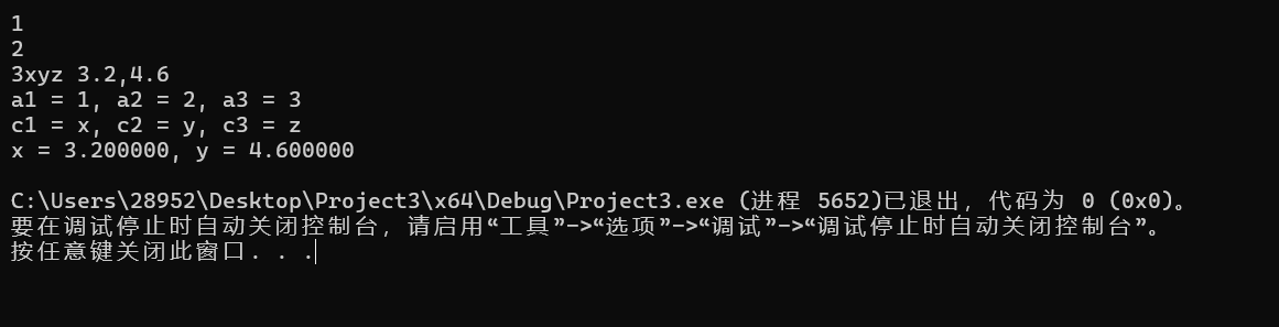 int main() { double x, y; char c1, c2, c3; int a1, a2, a3; scanf("%d%d%d", &a1, &a2, &a3); printf("a1 = %d, a2 = %d, a3 = %d\n", a1, a2, a3); scanf("%c%c%c", &c1, &c2, &c3); printf("c1 = %c, c2 = %c, c3 = %c\n", c1, c2, c3); scanf("%lf,%lf", &x, &y); printf("x = %lf, y = %lf\n", x, y); return 0; }
