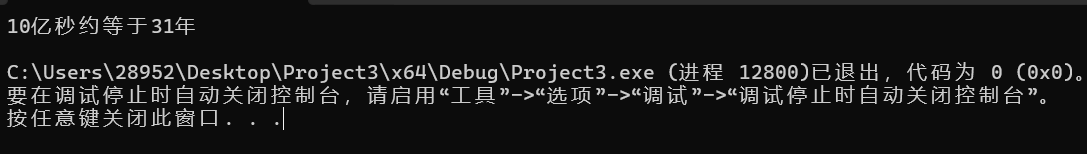 // 计算10亿秒约等于多少年,并打印输出 #include <stdio.h> int main() { int year; int s = 1000000000; int t = 60 * 60 * 24 * 365; year = s / t; printf("10亿秒约等于%d年\n", year); return 0; }