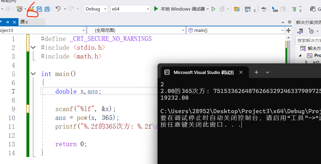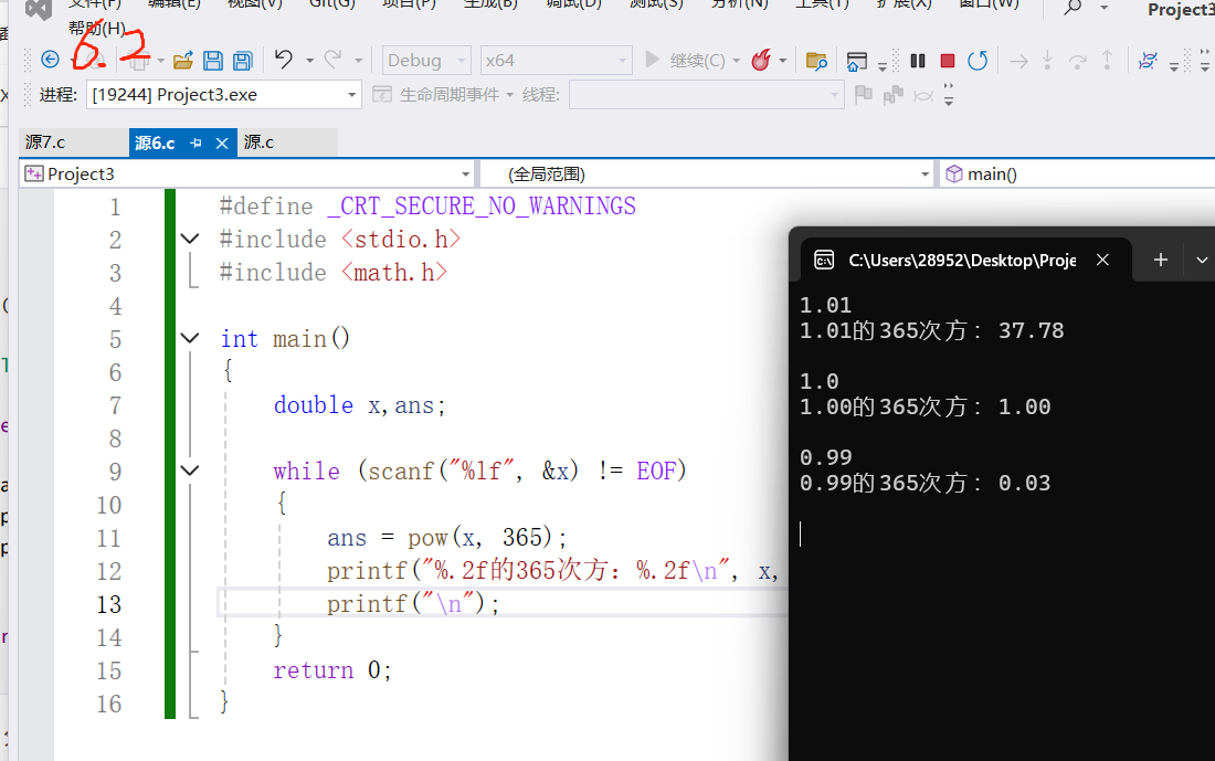 #define _CRT_SECURE_NO_WARNINGS #include <stdio.h> #include <math.h> int main() { double x,ans; scanf("%lf", &x); ans = pow(x, 365); printf("%.2f的365次方: %.2f\n", x, ans); return 0; } #define _CRT_SECURE_NO_WARNINGS #include <stdio.h> #include <math.h> int main() { double x,ans; while (scanf("%lf", &x) != EOF) { ans = pow(x, 365); printf("%.2f的365次方:%.2f\n", x, ans); printf("\n"); } return 0; }