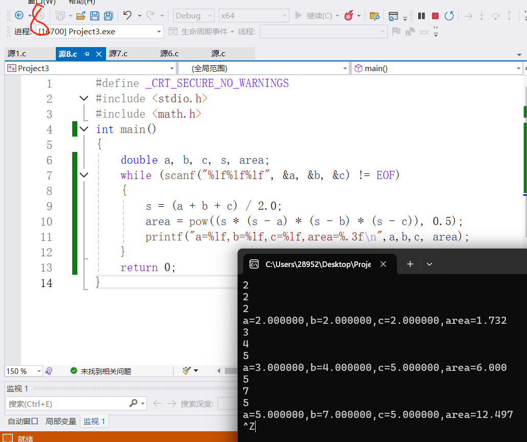 #define _CRT_SECURE_NO_WARNINGS #include <stdio.h> #include <math.h> int main() { double a, b, c, s, area; while (scanf("%lf%lf%lf", &a, &b, &c) != EOF) { s = (a + b + c) / 2.0; area = pow((s * (s - a) * (s - b) * (s - c)), 0.5); printf("a=%lf,b=%lf,c=%lf,area=%.3f\n",a,b,c, area); } return 0; }