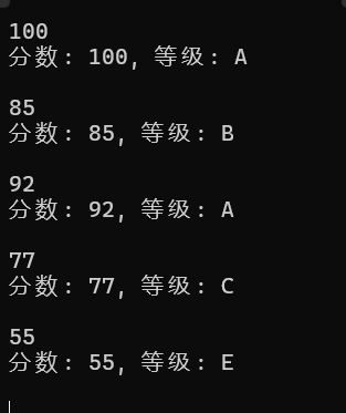 printf("分数: %d, 等级: %c\n\n", score, grade);