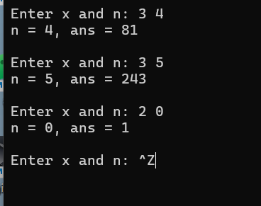 while(printf("Enter x and n: "), scanf("%d%d", &x, &n) != EOF) {