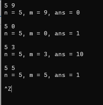 #include <stdio.h> int func(int n, int m); int main() { int n, m; int ans; while (scanf_s("%d%d", &n, &m) != EOF) { ans = func(n, m); printf("n = %d, m = %d, ans = %d\n\n", n, m, ans); } return 0; } int func(int n, int m) { if (m > n) return 0; if (m == 0 || m == n) return 1; int i; double result = 1.0; if (m > n - m) { m = n - m; } for (i = 0; i < m; i++) { result *= (n - i); result /= (i + 1); } return (int)result; }