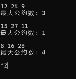 #define _CRT_SECURE_NO_WARNINGS #include <stdio.h> int gcd(int a, int b, int c); int main() { int a, b, c; int ans; while (scanf("%d%d%d", &a, &b, &c) != EOF) { ans = gcd(a, b, c); printf("最大公约数: %d\n\n", ans); } return 0; } int gcd(int a, int b, int c) { int min_num = a; if (b < min_num) { min_num = b; } if (c < min_num) { min_num = c; } for (int i = min_num; i >= 1; i--) { if (a % i == 0 && b % i == 0 && c % i == 0) { return i; } } return 1; }