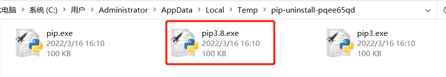 注意这里抓住关键语句:'C:\\Users\\Administrator\\AppData\\Local\\Temp\\pip-uninstall-pqee65qd\\pip.exe'