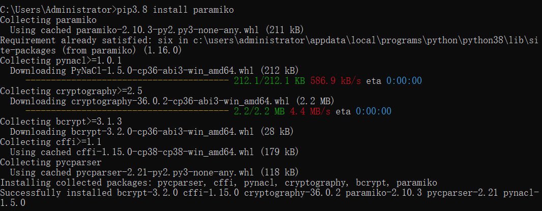 想到我的Python是3.8,于是我灵机一动,执行 pip3.8 install paramiko,然后就成功了!!!