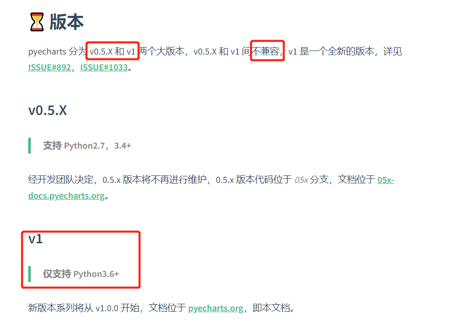需要注意python版本以及Pyecharts版本。 官方文档如此说明: