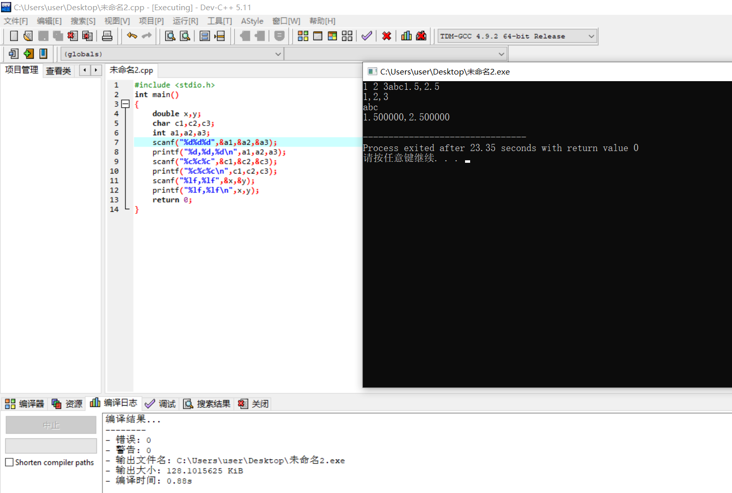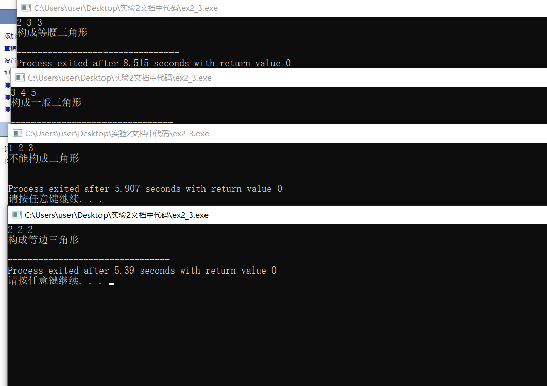 #include <stdio.h> int main() { double a,b,c; scanf("%lf %lf %lf", &a, &b, &c); if(a<0 || b<0 || c<0) printf("不能构成三角形\n"); else if(a+b>c && a+c>b && b+c>a) { if(a==b||a==c||b==c) { if(a==b&&a==c) printf("构成等边三角形\n"); else printf("构成等腰三角形\n"); } else printf("构成一般三角形\n"); } else printf("不能构成三角形\n"); return 0; }