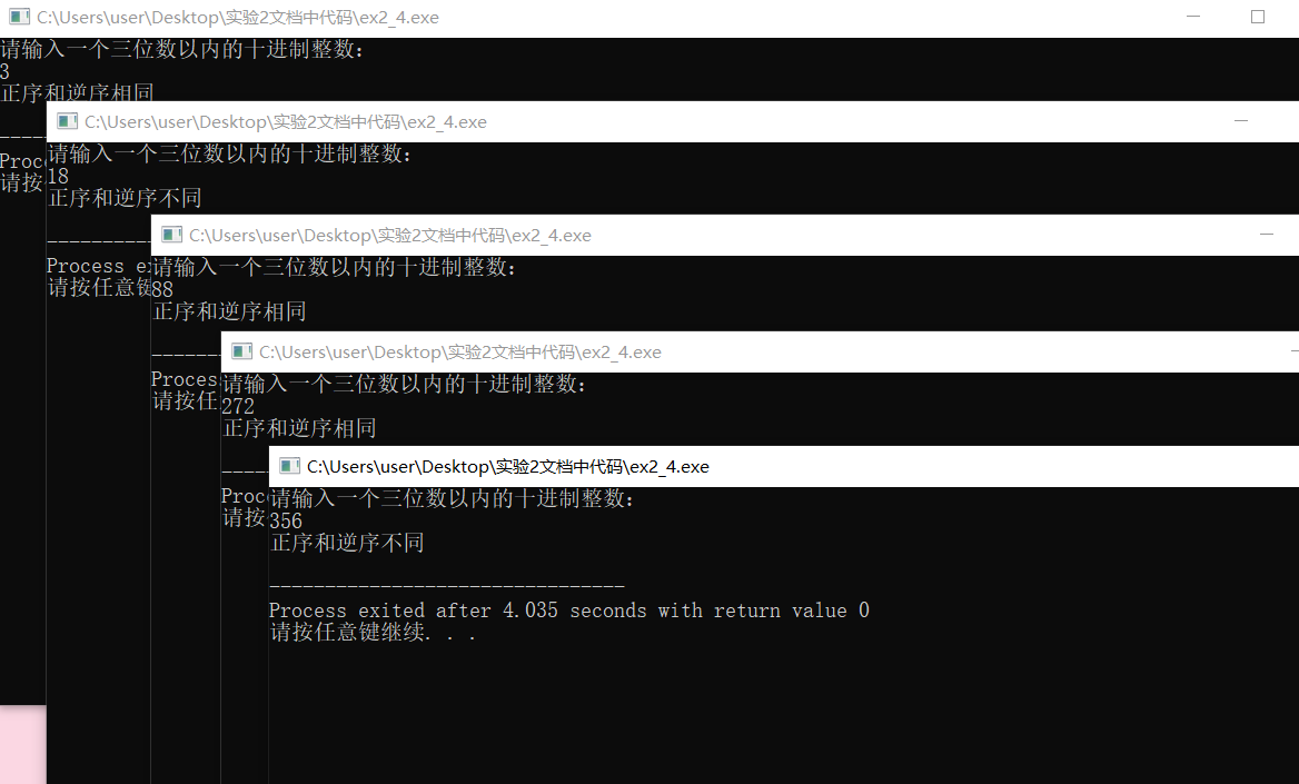 #include <stdio.h> int main() { int a,b,c; printf("请输入一个三位数以内的十进制整数:\n"); scanf("%d",&a); b=a/10+a%10*10; c=a/100+a%100/10*10+a%100%10*100; if (0<=a&&a<=999) if(a>100&&a<=999&&a==c) printf("正序和逆序相同\n"); else if(a>10&&a<100&&a==b ) printf("正序和逆序相同\n"); else if(a>0&&a<10) printf("正序和逆序相同\n"); else printf("正序和逆序不同\n"); return 0; }