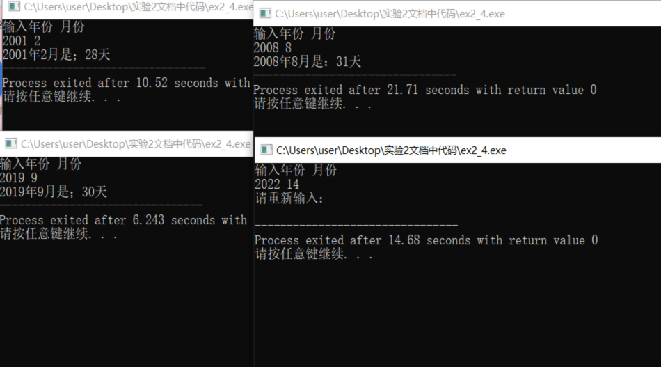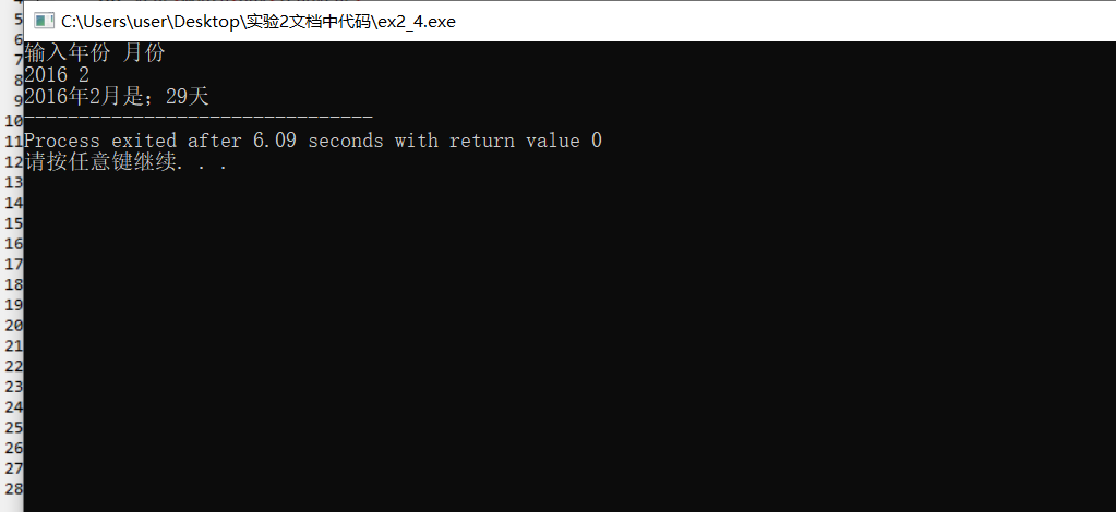 #include<stdio.h> int main() { int year,month,day,leapyear; printf("输入年份 月份\n"); scanf("%d %d",&year,&month); if(year<=0||month<=0||month>=13) { printf("请重新输入:\n"); } leapyear=year%4==0&&year%100!=0||year%400==0; if(month==1||month==3||month==5||month==7||month==8||month==10||month==12) { printf("%d年%d月是:31天",year,month,day); } if(month==4||month==6||month==9||month==11) { printf("%d年%d月是;30天",year,month,day); } if(month==2) { day=28+leapyear; printf("%d年%d月是;%d天",year,month,day); } return 0; }