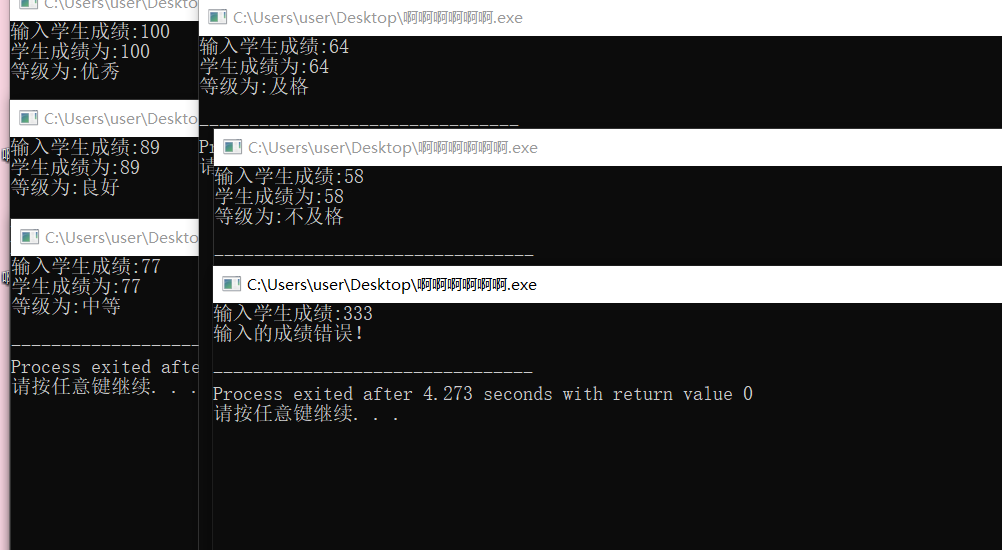 #include<stdio.h> int main() { int s; printf("输入学生成绩:"); scanf("%d",&s); switch(s/10) { case 10: case 9:printf("学生成绩为:%d\n等级为:优秀\n",s);break; case 8:printf("学生成绩为:%d\n等级为:良好\n",s);break; case 7:printf("学生成绩为:%d\n等级为:中等\n",s);break; case 6:printf("学生成绩为:%d\n等级为:及格\n",s);break; case 5: case 4: case 3: case 2: case 1:printf("学生成绩为:%d\n等级为:不及格\n",s);break; default:printf("输入的成绩错误!\n"); } return 0; }