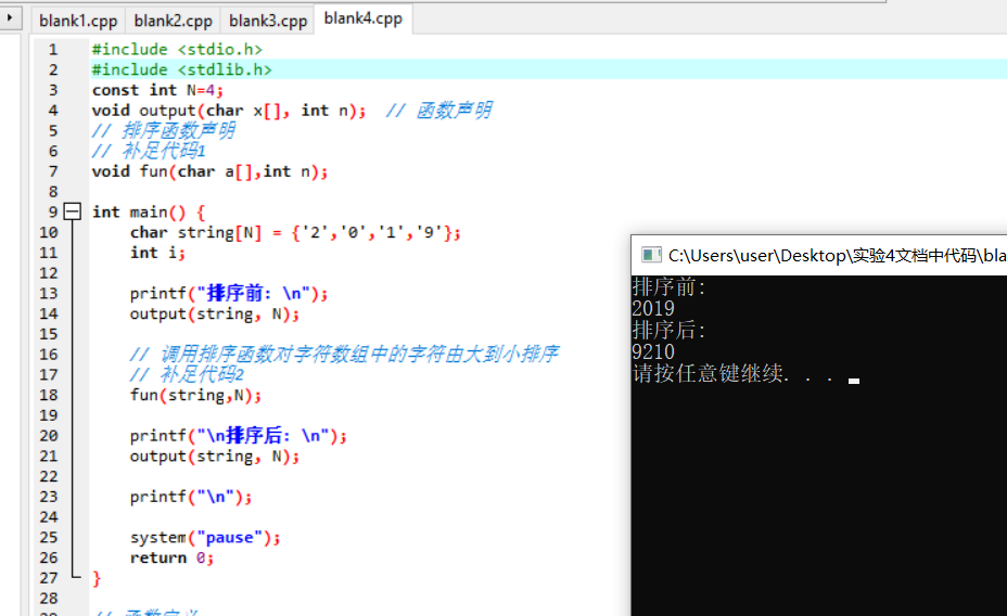 #include <stdio.h> #include <stdlib.h> const int N=4; void output(char x[], int n); // 函数声明 // 排序函数声明 // 补足代码1 void fun(char a[],int n); int main() { char string[N] = {'2','0','1','9'}; int i; printf("排序前: \n"); output(string, N); // 调用排序函数对字符数组中的字符由大到小排序 // 补足代码2 fun(string,N); printf("\n排序后: \n"); output(string, N); printf("\n"); system("pause"); return 0; } // 函数定义 // 函数功能描述:输出包含有n个元素的字符数组元素 // 形参:字符数组,以及字符数组元素个数 void output(char x[], int n) { int i; for(i=0; i<N; i++) printf("%c", x[i]); } // 函数定义 // 函数功能描述:对一组字符由大到小排序 // 形参:字符数组,以及字符数组元素个数 // 补足代码3 void fun(char a[],int N) { int i,j; char t; for(i=0;i<=N-1;i++) for(j=0;j<=N-i-1;j++) if(a[j]<a[j+1]) { t=a[j+1]; a[j+1]=a[j]; a[j]=t; } }