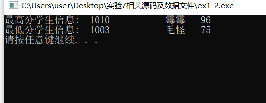 #include <stdio.h> #include <stdlib.h> #include <string.h> const int N = 10; // 定义结构体类型struct student,并定义其别名为STU typedef struct student { long int id; char name[20]; float objective; /*客观题得分*/ float subjective; /*操作题得分*/ float sum; char level[10]; }STU; // 函数声明 void input(STU s[], int n); void output(STU s[], int n); void process(STU s[], int n); int main() { STU stu[N]; printf("录入%d个考生信息: 准考证号,姓名,客观题得分(<=40),操作题得分(<=60)\n", N); input(stu, N); printf("\n对考生信息进行处理: 计算总分,确定等级\n"); process(stu, N); printf("\n打印考生完整信息: 准考证号,姓名,客观题得分,操作题得分,总分,等级\n"); output(stu, N); system("pause"); return 0; } // 从文本文件examinee.txt读入考生信息:准考证号,姓名,客观题得分,操作题得分 void input(STU s[], int n) { FILE *fp; int i; if((fp=fopen("examinee.txt","r"))==NULL) { printf("fail to open examinee.txt\n"); exit(0); } for(i=0;i<n;i++){ //从文件file.dat中读取数据到数组st if(fscanf(fp,"%ld %s %f %f",&s[i].id,&s[i].name,&s[i].objective,&s[i].subjective)==0) printf("fail"); } fclose(fp); } // 输出考生完整信息: 准考证号,姓名,客观题得分,操作题得分,总分,等级 // 不仅输出到屏幕上,还写到文本文件result.txt中 void output(STU s[], int n) { FILE *fp; int i; if((fp=fopen("result.txt","w"))==NULL); { printf("fail to open result.txt\n"); exit(0); } for(i=0;i<n;i++) { printf("%25d %8s %9.2f %9.2f %9.2f %s\n",&s[i].id,&s[i].name,&s[i].objective,&s[i].subjective,&s[i].sum,&s[i].level); fprintf(fp,"%25d %8s %9.2f %9.2f %9.2f %s\n",&s[i].id,&s[i].name,&s[i].objective,&s[i].subjective,&s[i].sum,&s[i].level); } fclose(fp); } // 对考生信息进行处理:计算总分,排序,确定等级 void process(STU s[], int n) { int i,j; STU temp; for(i=0;i<n;i++) s[i].sum=s[i].objective*0.4+s[i].subjective*0.6; for(i=0;i<n-1;i++) for(j=0;j<n-1-i;j++) if(s[j].sum<s[j+1].sum) { temp=s[j]; s[j]=s[j+1]; s[j+1]=temp; } for(i=0;i<=n*0.1;i++) strcpy(s[i].level,"优秀"); for(i=n*0.1;i<=n*0.5;i++) strcpy(s[i].level,"合格"); for(i=n*0.5;i<n;i++) strcpy(s[i].level,"不合格"); }