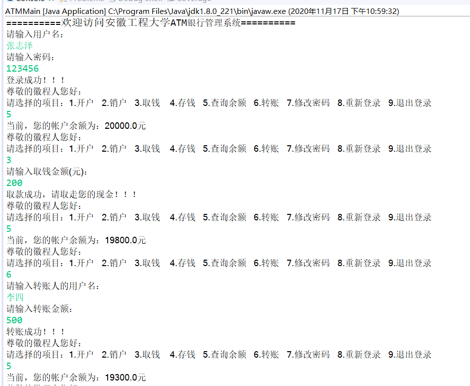 System.out.println("==========欢迎访问安徽工程大学ATM银行管理系统==========");
