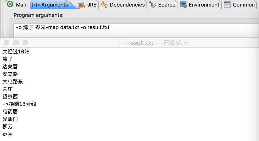 public class Data { public Data(String pathname) throws IOException{ File filename = new File(pathname); InputStreamReader reader = new InputStreamReader(new FileInputStream(filename)); //读取地图文件 BufferedReader br = new BufferedReader(reader); String content=""; content=br.readLine(); int linenum=Integer.parseInt(content); //linenum为地图中地铁总线数 for(int i=0;i<linenum;i++) { //向图中添加地铁线路 content=br.readLine(); List<Station> line=new ArrayList<Station>(); String[] linelist=content.split(" "); //去空格 String linename=linelist[0]; //读取线路的名称 for(int j=1;j<linelist.length;j++) { //向每条线路中添加站点 int flag=0; for(List<Station> l:lineSet) { //遍历线路集合 int t; for(t=0;t<l.size();t++) { if(l.get(t).getName().equals(linelist[j])) { //寻找换乘站进行处理 List<String> changelist=l.get(t).getLine(); changelist.add(linename); //向换乘列表内添加可以换乘的站点名字 l.get(t).setLine(changelist); line.add(l.get(t)); flag=1; //找到最近换乘点,跳出遍历 break; } } } if(linelist[j].equals(linelist[1])) { //添加站点名和起始站点名一致时,判断其为环线 line.get(0).getLinkStations().add(line.get(line.size()-1)); line.get(line.size()-1).getLinkStations().add(line.get(0)); flag=1; } if(flag==0) line.add(new Station(linelist[j],linename)); //既不是环线也不是换乘点直接添加 } for(int j=0;j<line.size();j++) { //添加每个车站相邻的车站 List<Station> newlinkStations=line.get(j).getLinkStations(); if(j==0) { //该站为起始站 newlinkStations.add(line.get(j+1)); line.get(j).setLinkStations(newlinkStations); } else if(j==line.size()-1) { //该站为终点站 newlinkStations.add(line.get(j-1)); line.get(j).setLinkStations(newlinkStations); } else { //中间站 newlinkStations.add(line.get(j+1)); newlinkStations.add(line.get(j-1)); line.get(j).setLinkStations(newlinkStations); } } lineSet.add(line); } br.close(); } }