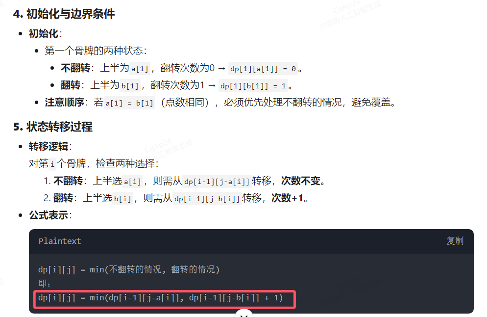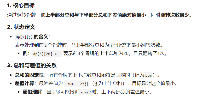 用dp[i][j]来表示当前考虑到第i个骨牌,第一行的总和为j的最小交换次数。记第一行骨牌的点数放入数组a,第二行骨牌的点数放入数组b,初始时令dp[1][a[1]]=0,dp[1][b[1]]=1。