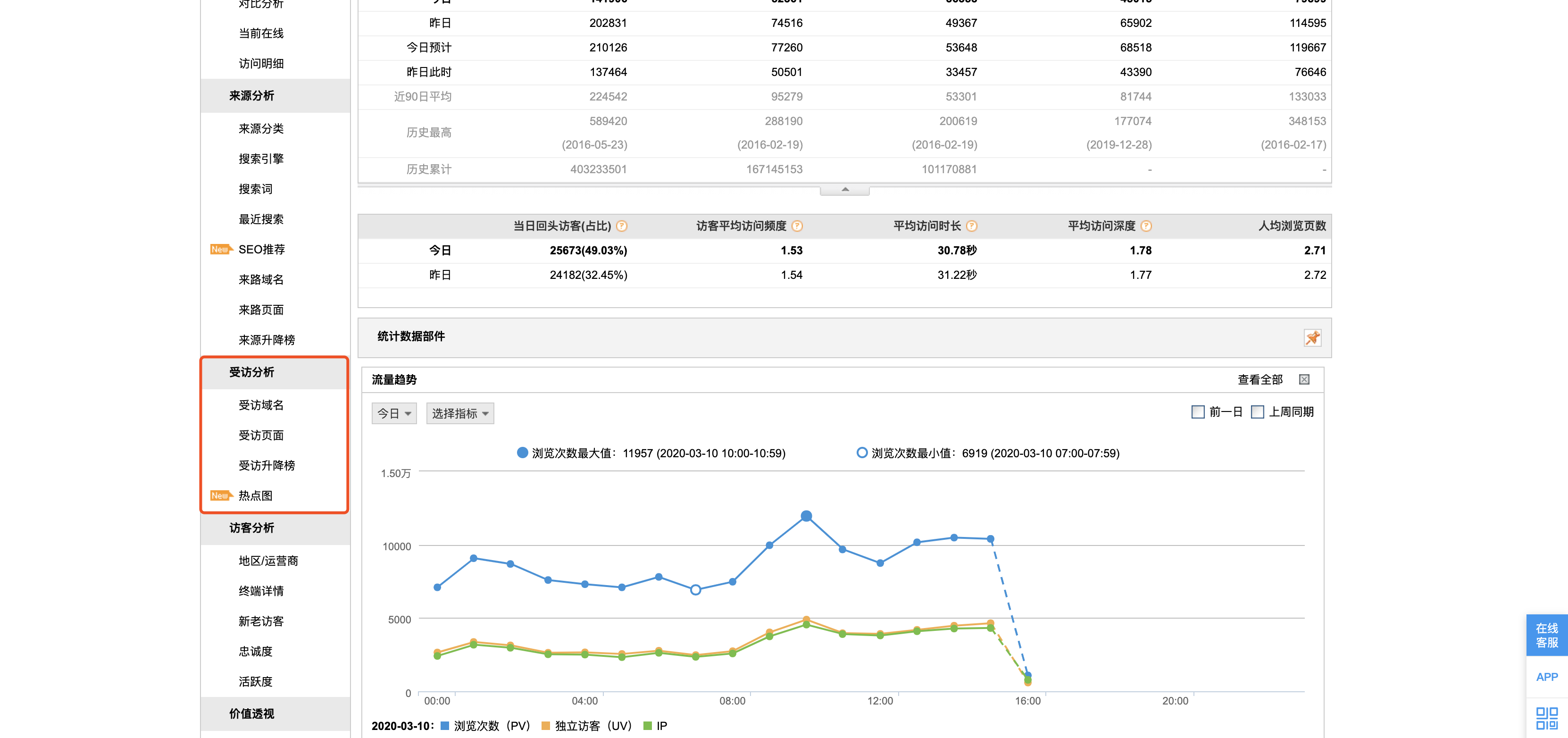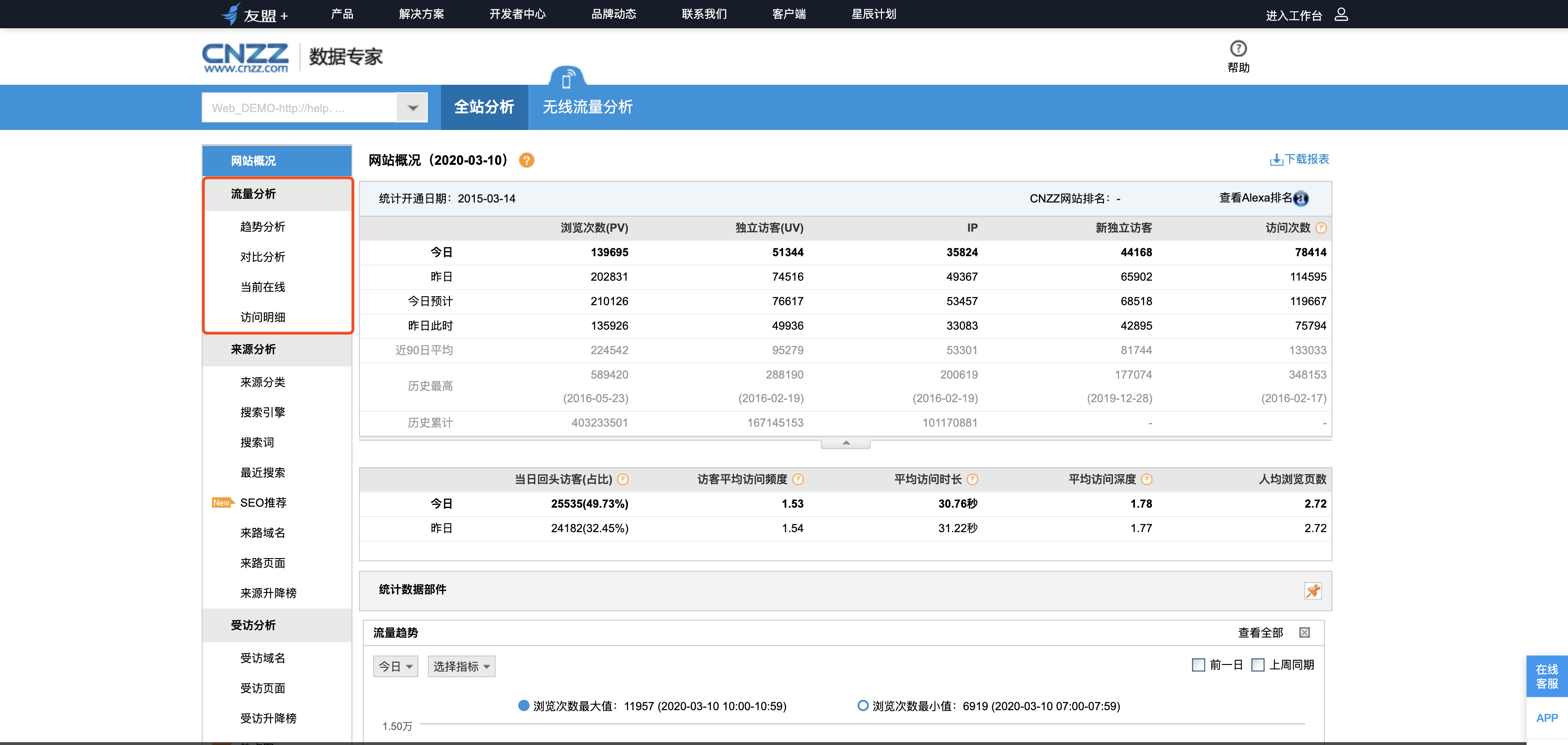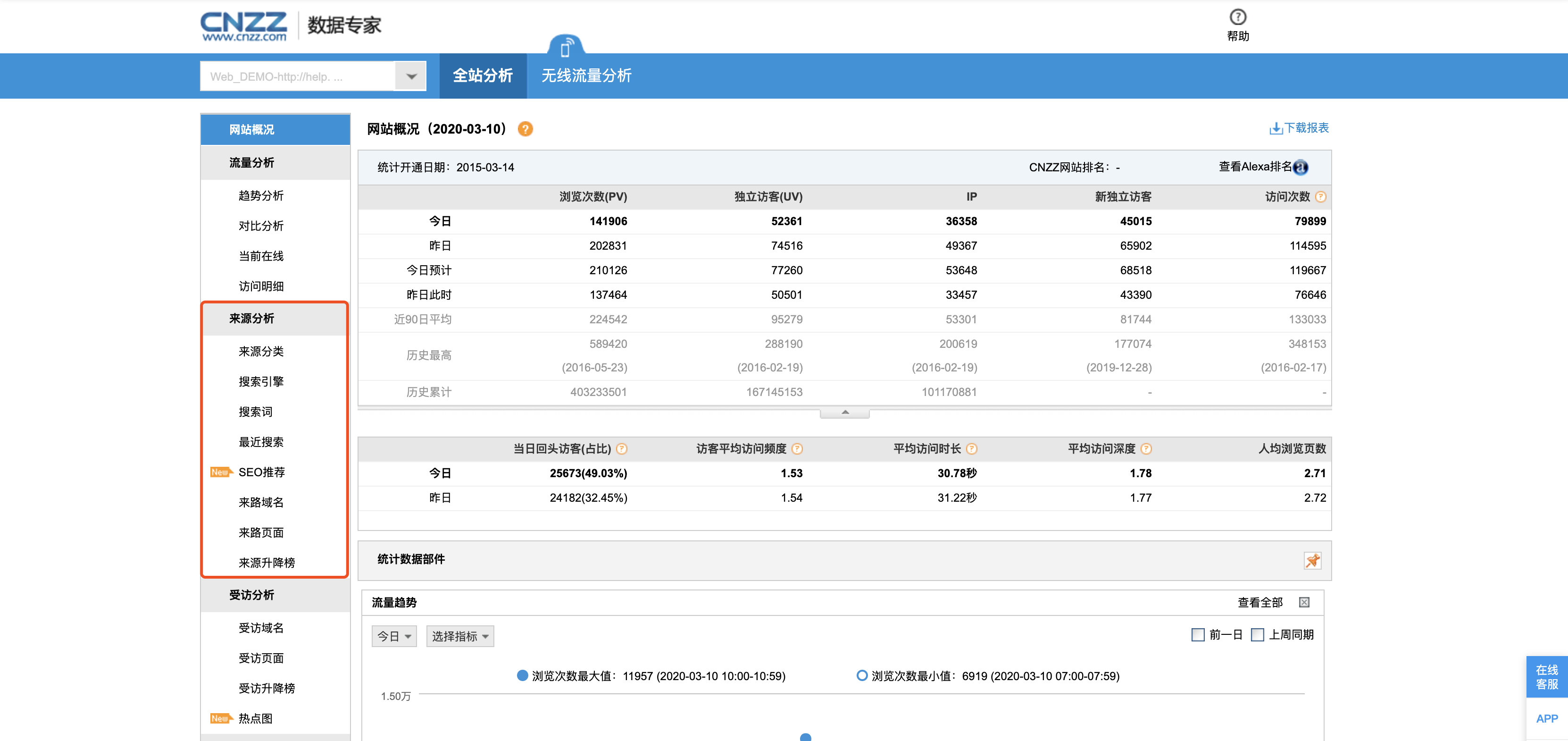 趋势分析: 根据选定的时段,提供网站流量数据,通过流量趋势变化形态,为您分析网站访客的访问规律、网站发展状况提供参考。