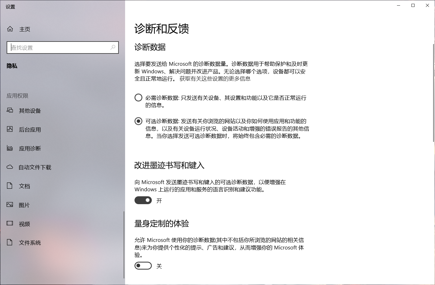 若Windows10的预览体验计划为空白,则需要勾选诊断与反馈中的可选诊断数据和下方的改进墨迹书写和键入选项